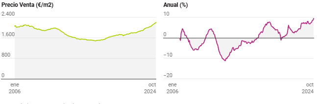 Le prix des logements en Espagne a enregistré une hausse de 9,6% en glissement annuel au cours du mois d’octobre, s’établissant à 2.209 euros/m2, selon le dernier indice des prix de l’immobilier d’idealista. Ce chiffre constitue un record pour le prix des logements en Espagne. Il représente également une augmentation de 2,6% au cours des 3 derniers mois et de 1,2% au cours du dernier mois.