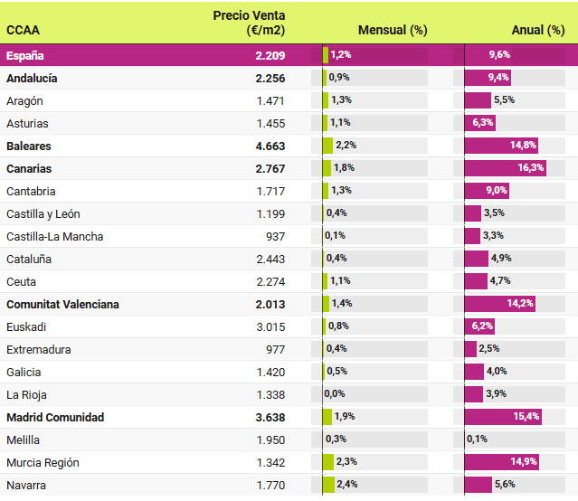 Les îles Baléares, avec 4.663 euros/m2, sont la région autonome la plus chère, suivie par la Communauté de Madrid (3.638 euros/m2). Viennent ensuite le Pays basque (3.015 euros/m2), les îles Canaries (2.767 euros/m2) et la Catalogne (2.443 euros/m2). À l’opposé du tableau, on trouve Castilla-La Mancha (937 euros/m2), l’Estrémadure (977 euros/m2) et Castilla y León (1 199 euros/m2), qui sont les communautés les moins chères.
