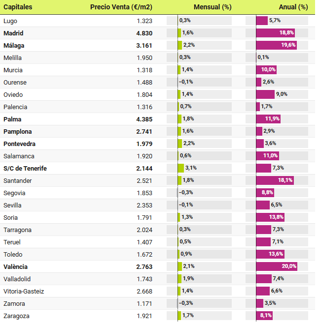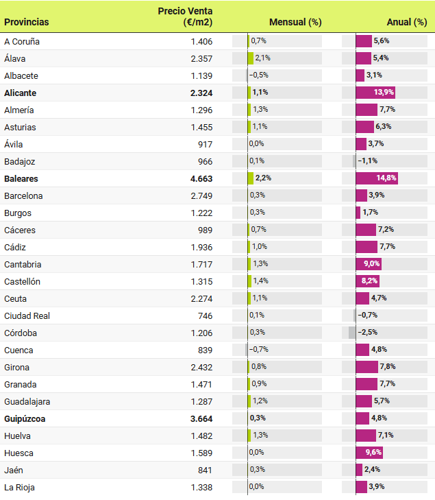 Dans 46 provinces, les prix sont supérieurs à ceux enregistrés il y a un an. Les plus fortes hausses ont été enregistrées à Santa Cruz de Tenerife, où les attentes des vendeurs ont augmenté de 16,4%, suivie de Las Palmas (16%), de la communauté de Madrid (15,4%), de la région de Murcie (14,9%), des Baléares (14,8%), d’Alicante (13,7%) et de Málaga (12,7%). D’autre part, seules 4 provinces ont connu des baisses de prix au cours de l’année écoulée, il s’agit de : Ourense (-3,2%), Cordoba (-2,5%), Badajoz (-1,1%) et Ciudad Real (-0,7%).