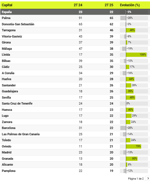 Le nombre de personnes intéressées par chaque chambre a diminué de 2 % à l’échelle nationale, mais ce chiffre a augmenté dans 34 capitales. La plus forte hausse a été enregistrée à Logroño, avec une hausse de 114 %. Parmi les grands marchés, la croissance a également été observée à Séville (48 %) et à Alicante (8 %).
