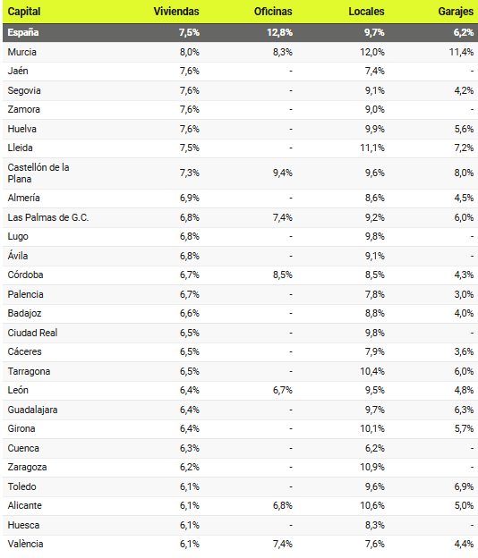 Parmi les capitales espagnoles, Murcie est la plus rentable, avec un rendement de 8 %, suivie de Jaén, Ségovie, Zamora et Huelva, qui partagent un rendement de 7,6 %. Au-dessus de 7 %, on trouve Lérida (7,5 %) et Castellón de la Plana (7,3 %). Viennent ensuite Almería (6,9 %), Las Palmas de Gran Canaria, Lugo et Ávila (6,8 % dans les trois cas). En revanche, Saint-Sébastien est la ville affichant la rentabilité la plus faible (3,7 %), suivie de Palma (4,5 %), Cadix, Madrid, La Corogne et Pampelune (4,7 % dans les quatre capitales). À Barcelone, ce taux s’élève à 5,8 %.