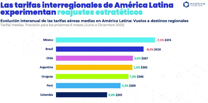 L’accessibilité des tarifs aériens demeure un défi structurel pour le développement du tourisme en Amérique latine, comme le montre l’analyse des prévisions tarifaires pour les mois à venir réalisée par Mabrian, cabinet mondial de conseil stratégique et d’intelligence touristique. Les données révèlent un tableau contrasté, avec des hausses modérées, des réajustements stratégiques et des baisses marquées, influencés par des facteurs géopolitiques et la dynamique du marché, qui pourraient redéfinir la compétitivité du tourisme régional d’ici fin 2025.