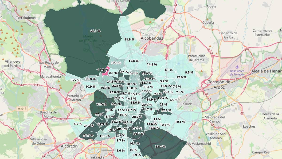 Le quartier d’El Pardo, situé dans le district de Fuencarral-El Pardo, connaît la plus forte augmentation des loyers. Dans cette partie de la ville, le prix a augmenté de 40,1% d’une année sur l’autre pour atteindre 15,3 euros par mètre carré par mois, tandis qu’au cours des trois derniers mois, il a augmenté de 27,3%.
