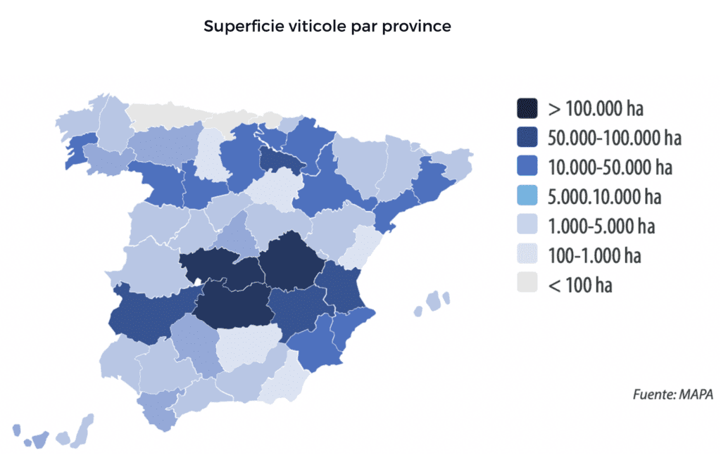 LOCALISATION. Il existe une forte concentration géographique dans les zones intérieures de la péninsule. Son poids le plus important se situe en Castille-La Manche (48% de la superficie totale de cette culture, où se distinguent Tolède, Cuidad Real et Cuenca), en Estrémadure (8,7%), en Castille-Leon (7,9%) et en La Rioja (5,6%).
