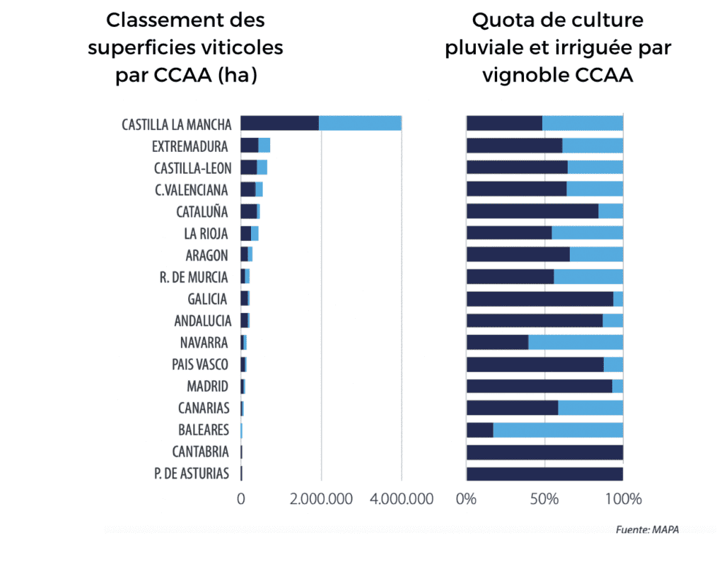 Irrigation. 42% de la superficie totale du vignoble est irriguée. Cela représente 11 % de la superficie totale irriguée au niveau national.