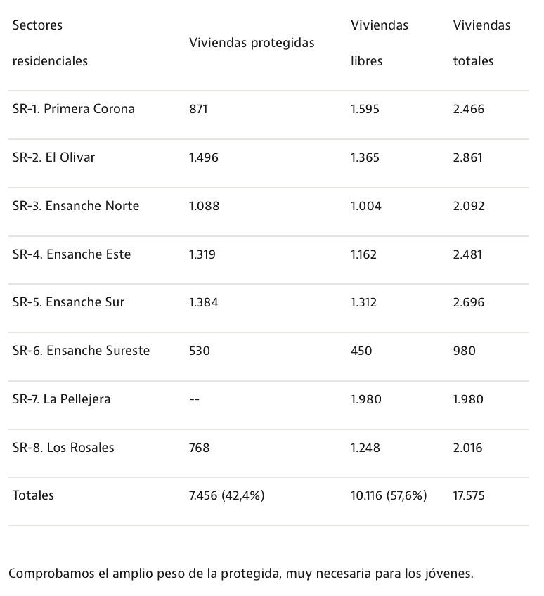 À eux 2, ils totaliseront plus de 17.500 logements, dont 42% bénéficieront d’un certain type de protection. Ce chiffre dépasse les 10.000 logements prévus à Madrid Nuevo Norte et la plupart des zones en cours de développement dans le sud-est de Madrid. Le tableau suivant indique le nombre de logements par secteur, en distinguant les logements protégés des logements libres :