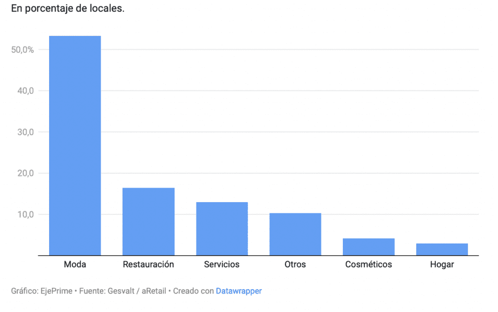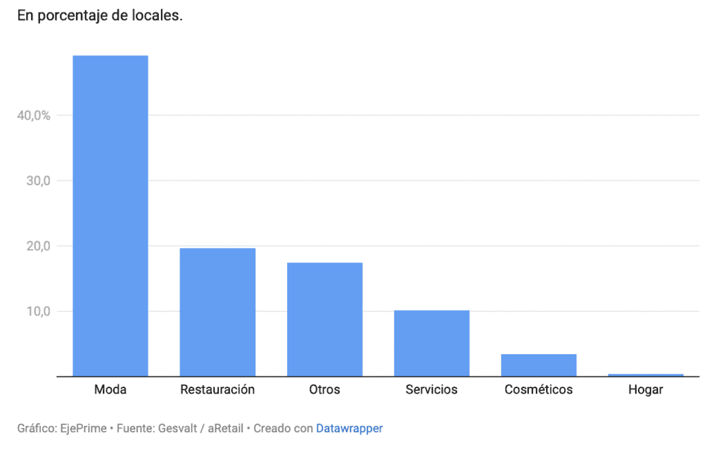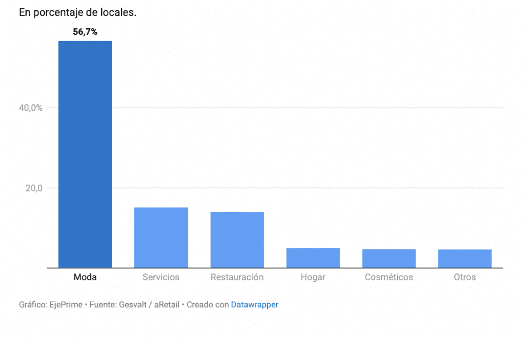 Plus de la moitié de l’espace commercial des principales artères du pays est occupé par des entreprises de mode, tandis que le secteur de la maison est celui qui occupe le moins d’espace dans le total général, avec 2,9%.
