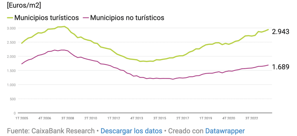 CaixaBank Research répertorie 64 municipalités comme villes touristiques, avec un prix moyen de 2.943 €/m2. En 2023, la différence avec le reste des villes est maximale.