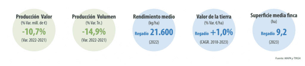 L’analyse géographique révèle que la Communauté de Valence est la région qui a connu les plus fortes baisses de la valeur des terres, la Région de Murcie s’est maintenue et l’Andalousie a enregistré de légères hausses. Ces évolutions différentes sont dues aux différentes espèces et variétés cultivées dans chaque région, qui sont affectées différemment par la concurrence des importations, en particulier pour certaines variétés d’agrumes.