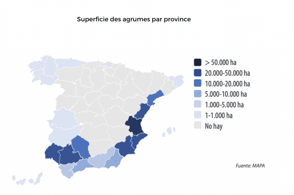LOCALISATION. Elles sont fortement concentrées sur la côte méditerranéenne et dans les zones intérieures du sud de la péninsule ibérique, notamment dans la communauté de Valence (50,4%), en Murcie (14,8 %) et en Andalousie (30,9%, en particulier à Séville et à Huelva).
