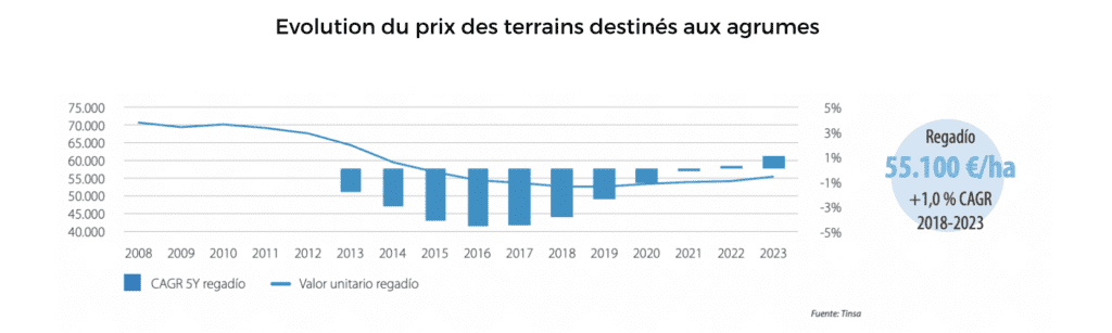 Dans les principales régions productrices d’agrumes, la valeur des terres consacrées à la culture des agrumes a connu une tendance à la baisse entre 2010 et 2020, en partie à cause de la concurrence des importations. Depuis 2020, la valeur de ces terres s’est stabilisée et a légèrement augmenté.
