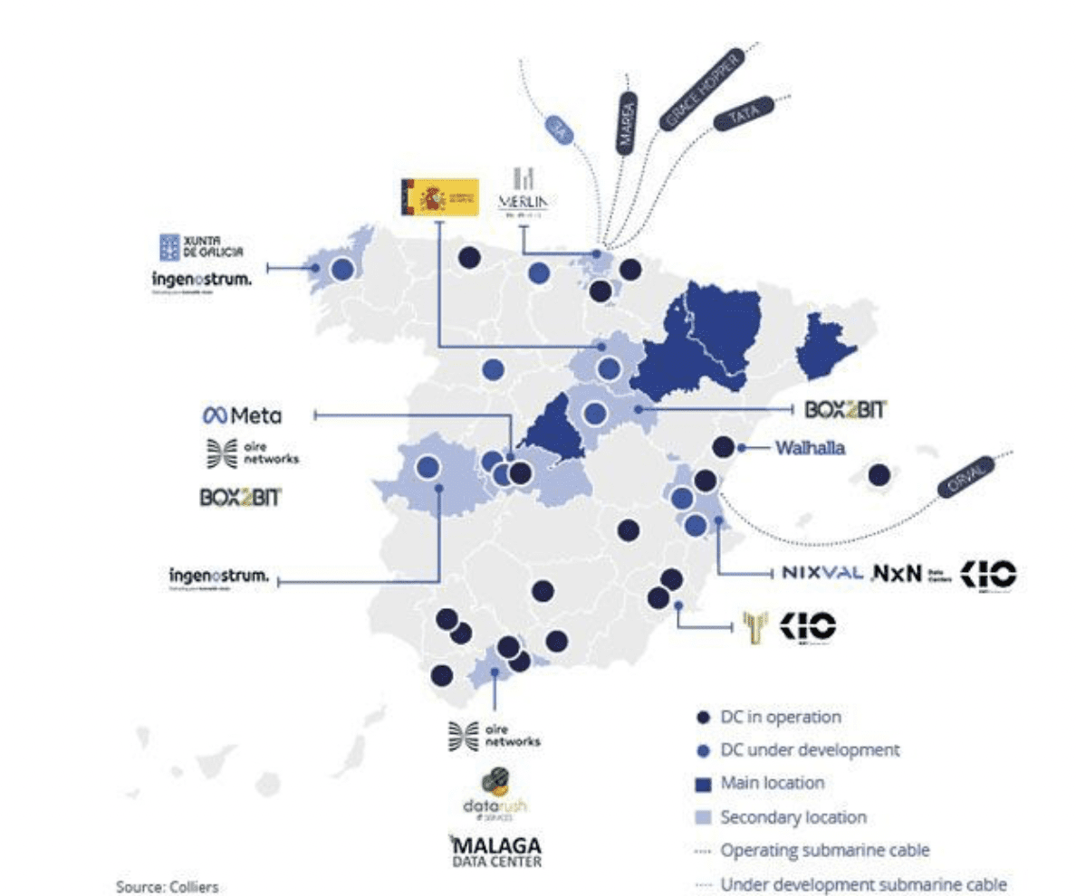 À cet égard, une étude récente de Colliers souligne que Madrid et Barcelone ont considérablement augmenté la puissance installée dans les centres de données en 2023, notamment de 56% et 79% respectivement par rapport à 2022.