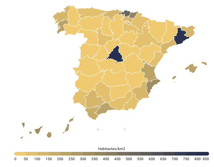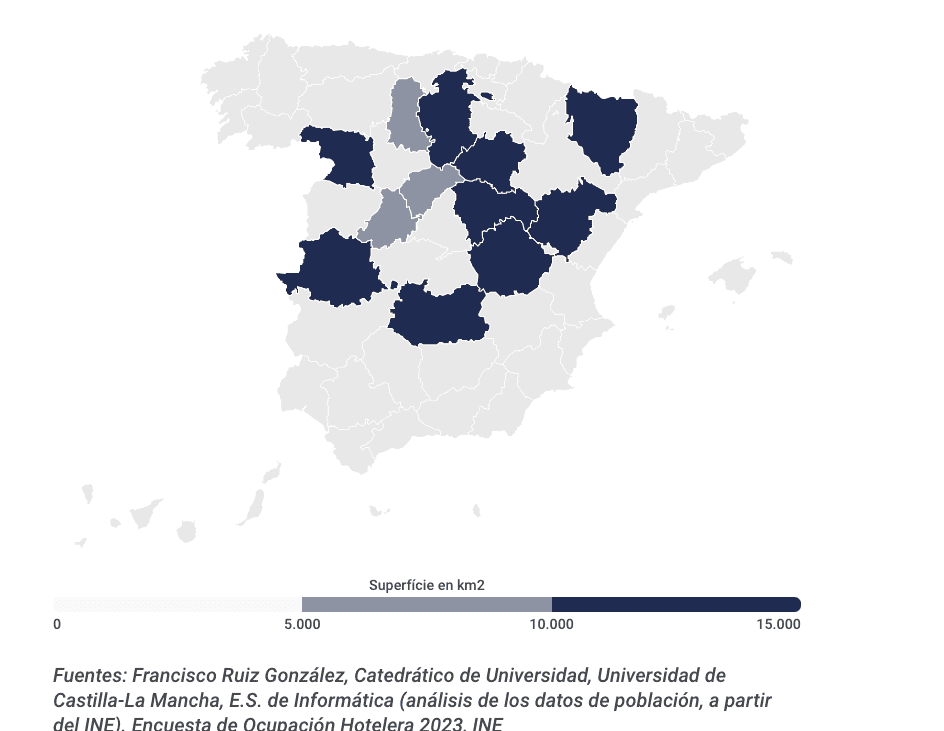 Les données montrent l’existence de douze provinces à l’intérieur de la péninsule ibérique, dont la densité de population est alarmante, inférieure à 25 habitants par km2.