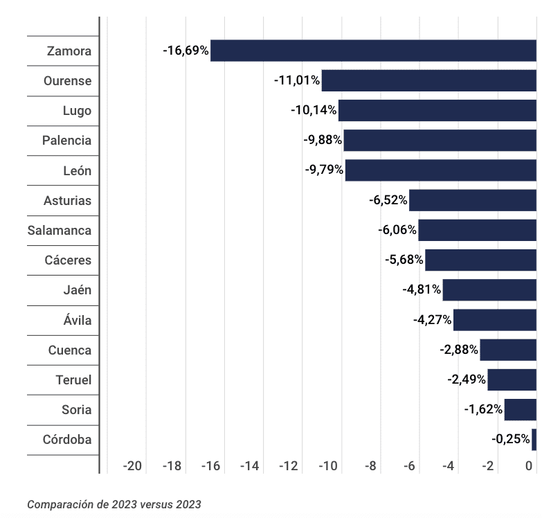 Par ailleurs, les données fournies par Francisco Ruiz montrent que le dépeuplement est un phénomène qui se poursuit. Au cours des 20 dernières années, par exemple, le nombre d’habitants dans la province de Zamora a diminué de 16% ; à Palencia, de 9,8% ; à Cáceres, de 5%, etc.