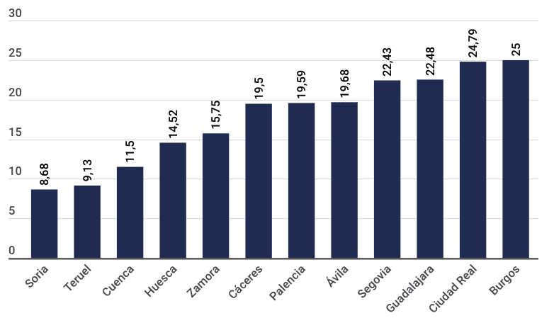 31,15% :Près d’un tiers de la superficie de l’Espagne correspond aux 12 provinces les moins densément peuplées.