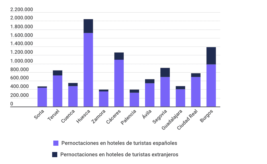 En revanche, ces douze provinces ont attiré à peine 1,7% des voyageurs internationaux qui ont séjourné dans des établissements hôteliers en Espagne l’année dernière. Traduit en nuitées hôtelières, le chiffre est encore plus bas : elles représentent à peine 0,75% de l’ensemble du pays.