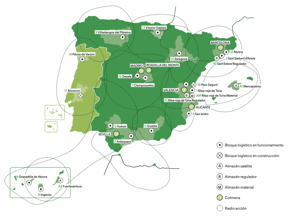 Mercadona dispose d’un réseau logistique efficace de 1,4 million de m2 réparti entre 17 blocs logistiques, un en construction à Almeirim (Santarém), 2 entrepôts satellites, 2 entrepôts tampons et 1 entrepôt de matériel. C’est par ce biais qu’elle approvisionne les 1 681 supermarchés que compte l’entreprise (1 632 en Espagne et 49 au Portugal), grâce à l’implication et au travail d’une équipe de plus de 13 000 personnes, dont la spécialisation et le professionnalisme sont essentiels pour garantir l’efficacité et la stabilité de la chaîne d’approvisionnement au quotidien.