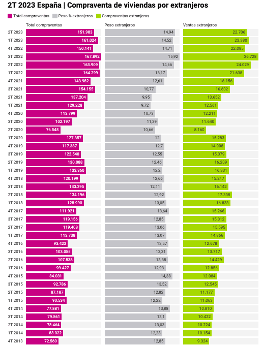 Il s’agit de la deuxième plus grande part du nombre total de ventes et d’achats dans la série historique publiée trimestriellement par l’Association des Registres Fonciers depuis 2013, seulement dépassée par les 15,92% du troisième trimestre 2022. En outre, il s’agit du quatrième chiffre absolu le plus élevé pour les transactions effectuées par des étrangers au cours d’un seul trimestre, qui ont toutes eu lieu entre 2022 et 2023.