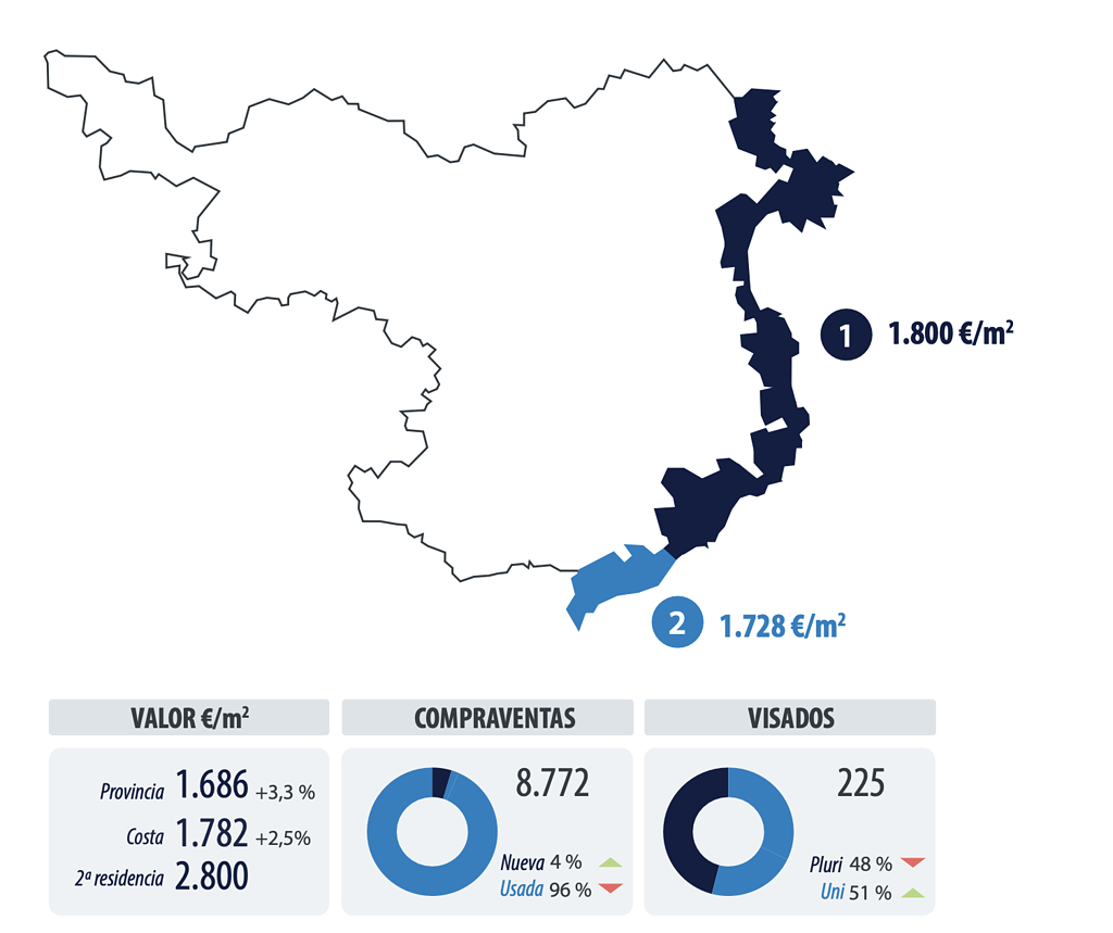 Le marché des communes côtières de Gérone a l’un des poids les plus faibles de la province, représentant 54% des ventes et des achats et 16% des approbations. En 2022, il a été plus dynamique en termes de ventes et d’achats et moins en termes de visas que l’ensemble de la province.
