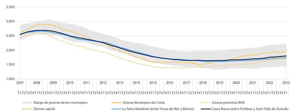 Le prix des maisons de vacances sur la côte augmente et est nettement plus élevé que le prix moyen. Il s’élève en moyenne à 2.300€/m2 sur la Costa Brava et à 3.000€/m2 dans la Selva Marítima, contre une valeur moyenne globale des logements dans les communes côtières de Gérone de 1.782 €/m2 et une valeur moyenne pour l’ensemble de la province de 1 686 €/m2.