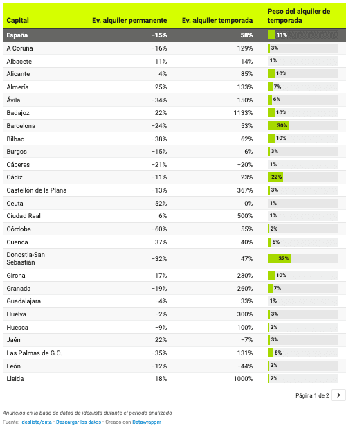 Les augmentations les plus importantes et les plus spectaculaires de l’offre ont eu lieu sur de petits marchés où ce phénomène était jusqu’à présent pratiquement inexistant et où l’apparition d’une poignée d’annonces a provoqué des hausses très fortes. Ce sont les cas de Badajoz (1133%), Lleida (1000%) ou Ciudad Real (500%). En revanche, dans 6 capitales, les loyers temporaires ont été réduits cette année : Zamora (-60%), Teruel (-50%), León (-44%), Soria (-33%), Cáceres (-20%) et Jaén (-7%).