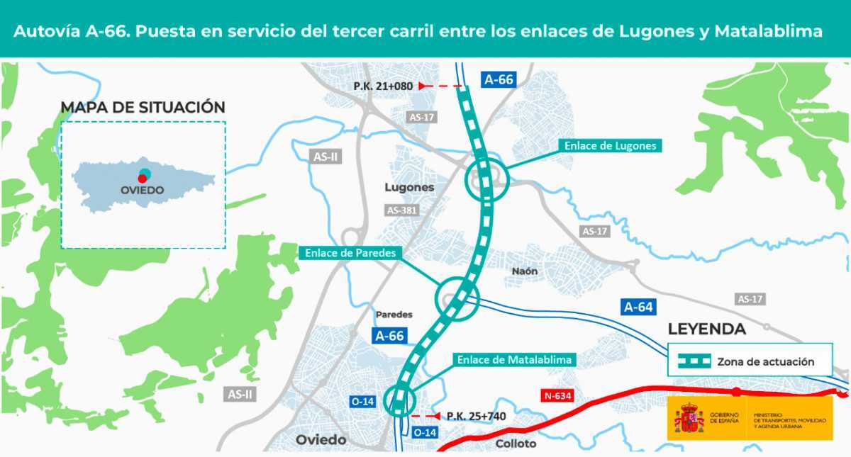 Outre le prolongement d’une troisième voie, le projet comprend le réaménagement des carrefours de Lugones, Paredes et Matalablima, un travail qui améliore la capacité de la route la plus fréquentée de la région et la mobilité dans une zone où se trouvent un grand nombre de parcs d’activités et d’importants centres de population tels qu’Oviedo et Lugones.