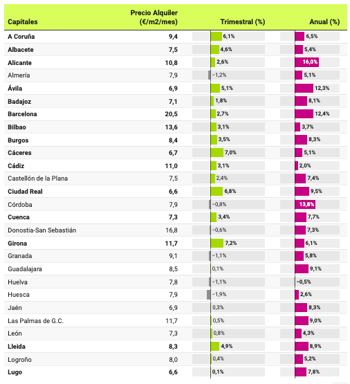 Capital dans lequel le prix du loyer a le plus augmenté au cours de ces 12 mois, avec une augmentation de 24,6%. Avec des augmentations supérieures à 20% se situent Valence (21%) et Palma (20,2%). Viennent ensuite Alicante (16%), Malaga (14,5%), Cordoue (13,8%), Madrid (13,6%) et Barcelone (12,4%). La seule baisse a été enregistrée à Huelva, avec une réduction des attentes des propriétaires de 0,5%.