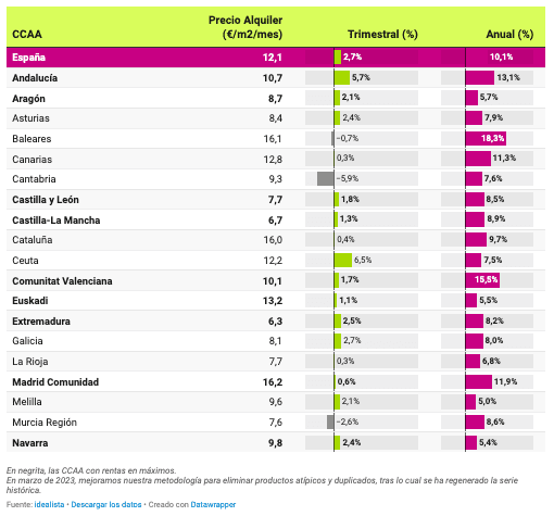 Le prix a augmenté dans toutes les communautés au cours de 2023. La plus forte hausse a été enregistrée aux Baléares (18,3%), dans la Communauté valencienne (15,5%), en Andalousie (13,1%), dans la Communauté de Madrid (11,9%) et dans les îles Canaries (11,3%). La Catalogne (9,7%), la Castille-La Manche (8,9%), la Murcie (8,6%) et la Castille-et-León (8,5%) enregistrent des hausses à un seul chiffre. La plus faible hausse a été enregistrée en Navarre (5,4%), en Euskadi (5,5%) et en Aragon (5,7%).