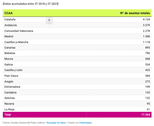 Si l’on examine les données accumulées par communauté autonome, on découvre que la Catalogne est en tête du classement national, avec plus de 4.100 procès en cinq ans, soit pratiquement un quart du total (23,9%).