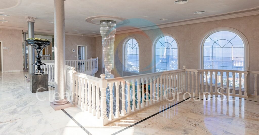 Dans l’immense cour se trouve également un curieux jeu d’échecs de taille humaine qui ravira les amateurs d’échecs. Après avoir accédé à la propriété par la terrasse supérieure, l’impressionnant atrium en forme de balcon impressionnera tous ceux qui décideront d’acheter la propriété avec son vitrage spectaculaire qui offre une vue incroyable sur l’océan.