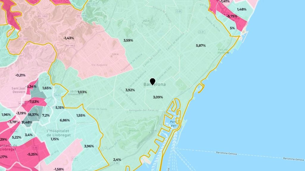 Cependant, cette croissance n’a pas été la même dans toutes les zones de Barcelone. En effet, alors que dans certains quartiers comme Sant Martí, L’Eixample, Gràcia, Nou Barris, Sant Andreu et Ciutat Vella, les prix des logements ont augmenté de plus de 3% au cours de l’année écoulée, dans d’autres, ils ont baissé.