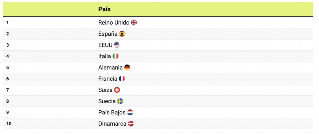 En outre, l’Italie et l’Allemagne occupent respectivement la quatrième et la cinquième place de ce classement. Elles sont suivies par la France, la Suisse, la Suède, les Pays-Bas et le Danemark.