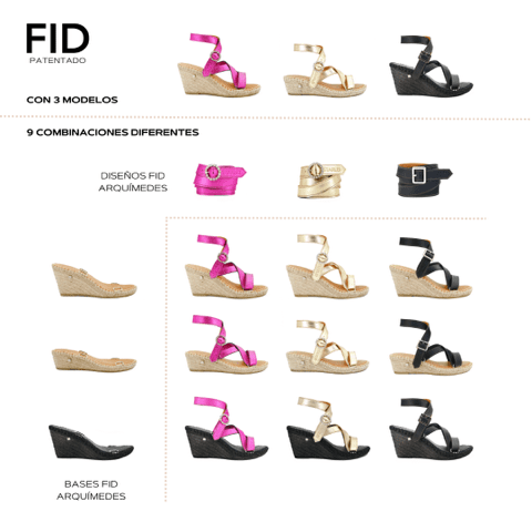 Les chaussures FID sont composées de bases et de motifs qui peuvent être combinés les uns avec les autres, créant ainsi différents modèles. Nous appelons base tout ce qui se trouve sous la plante du pied et dessin tout ce qui se trouve au-dessus. Le système d’assemblage des chaussures FID est breveté.