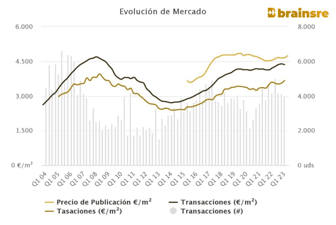 D’autre part, le prix des logements d’occasion s’élève à 4.719€ par m2. Au cours de l’année écoulée, le prix des logements d’occasion a augmenté de 2,9%, tandis qu’au cours des trois derniers mois, il a augmenté de 1,8%, selon les données de Brainsre.