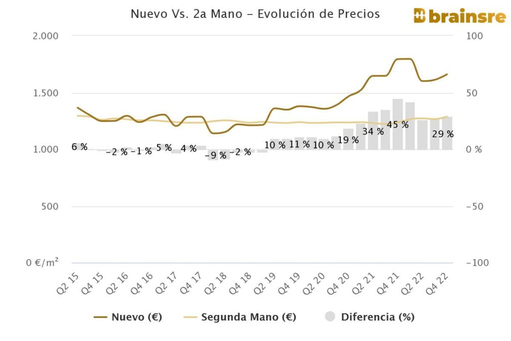 Si nous analysons le prix d’un logement neuf à Murcie, nous constatons qu’il atteint 1.660 euros par mètre carré, ce qui représente une baisse de 7,5% au cours de l’année dernière, bien qu’une légère reprise de 3% ait été enregistrée au cours des trois derniers mois. D’autre part, une propriété d’occasion coûte 1.287 euros par m2, ce qui représente une augmentation de 4,2% en un an et de 1,7% en un trimestre.