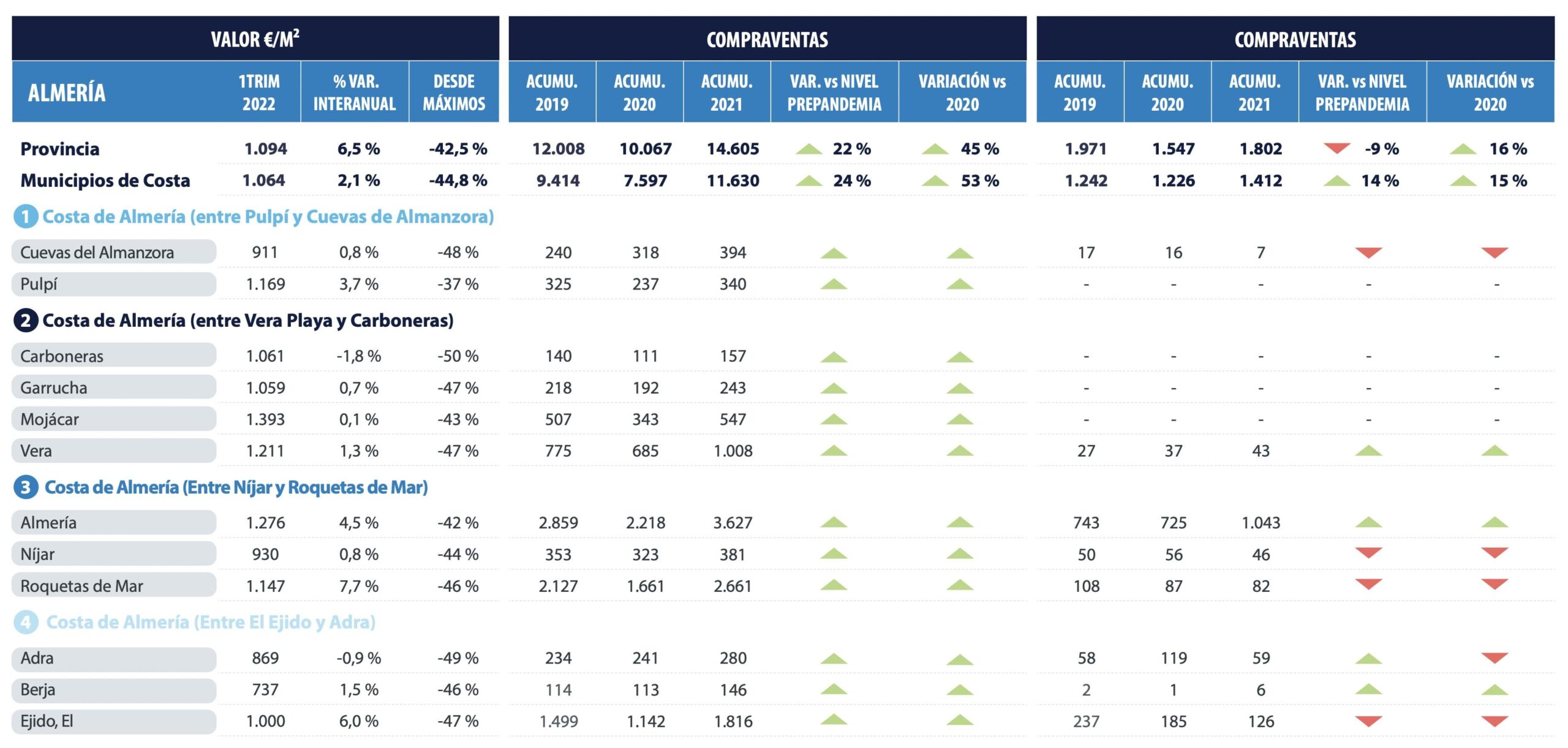 En 2021, le marché se redresse par rapport aux volumes de 2019 et croît en termes de ventes, d’homologations et de prix, une tendance qui se poursuit en 2022. Au cours des premiers mois de l’année, le prix moyen des municipalités côtières a augmenté de 2,1 % en glissement annuel dans un scénario de forte demande dans toutes les zones face à une activité modérée des promoteurs, avec des rétractions dans certains endroits et des chiffres positifs dans d’autres.