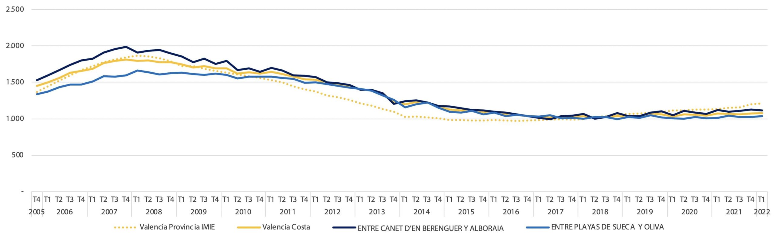 Au cours du dernier semestre de 2021 et du premier semestre de 2022, les résidences secondaires sur la côte ont connu une période de reprise, avec un nombre d’acheteurs élevé et des prix supérieurs aux niveaux de 2019, les variations étant attribuées à une réactivation de la demande et à une certaine limitation de l’activité des promoteurs.