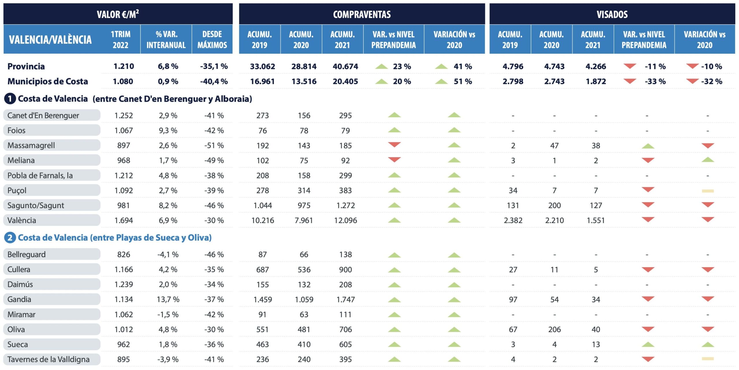 Le prix des résidences secondaires est entre 30 et 70 % plus élevé que celui des résidences principales. Les maisons de vacances coûtent en moyenne 1 400 €/m2 en typologie unifamiliale et 1 800 €/m2 en typologie multifamiliale. La valeur moyenne des logements généraux dans les municipalités côtières de Valence est de 1 080 €/m2.