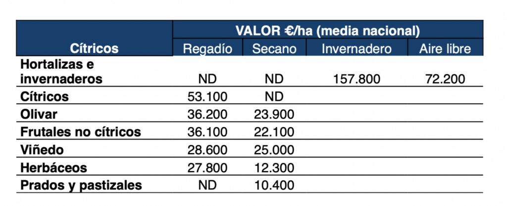 Etant donné que la valeur des terres agricoles est associée à leur rendement, entendu comme la production générée par chaque unité de surface, les terres les plus valorisées correspondent à la modalité irriguée, principalement les légumes et les agrumes, bien que ces derniers (et les arbres fruitiers en général) subissent des une certaine crise liée à la fragmentation et à la concurrence d’autres pays.