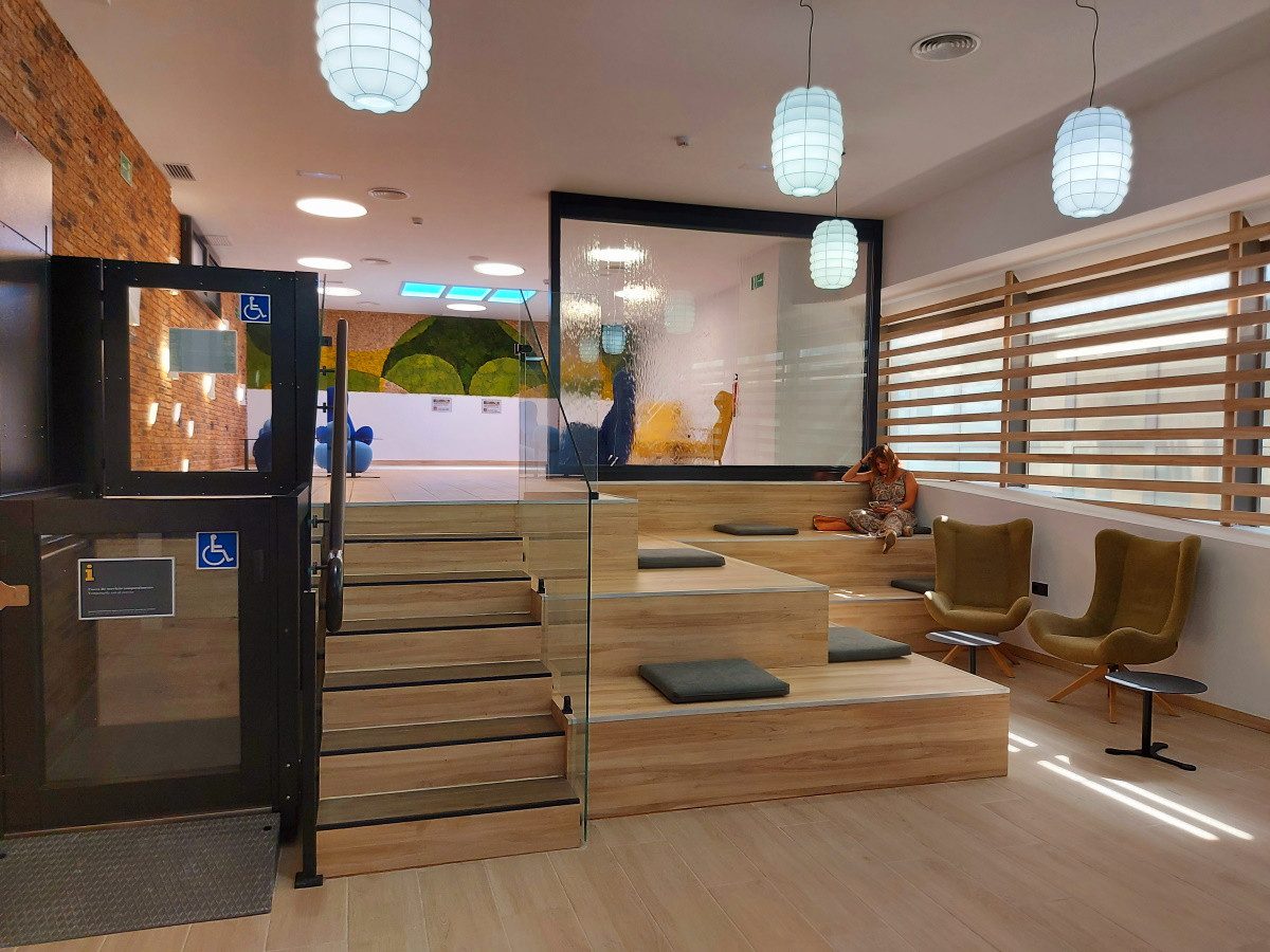 La « salle du silence » est structurée sur deux niveaux reliés par un escalier et une rampe d’ascenseur qui garantissent une accessibilité totale. Afin de rendre le temps d’attente des passagers plus agréable, il comporte des éléments tels qu’un jardin vertical de mousse, un panneau solaire, des marches avec des sièges relaxants et un mur d’eau.