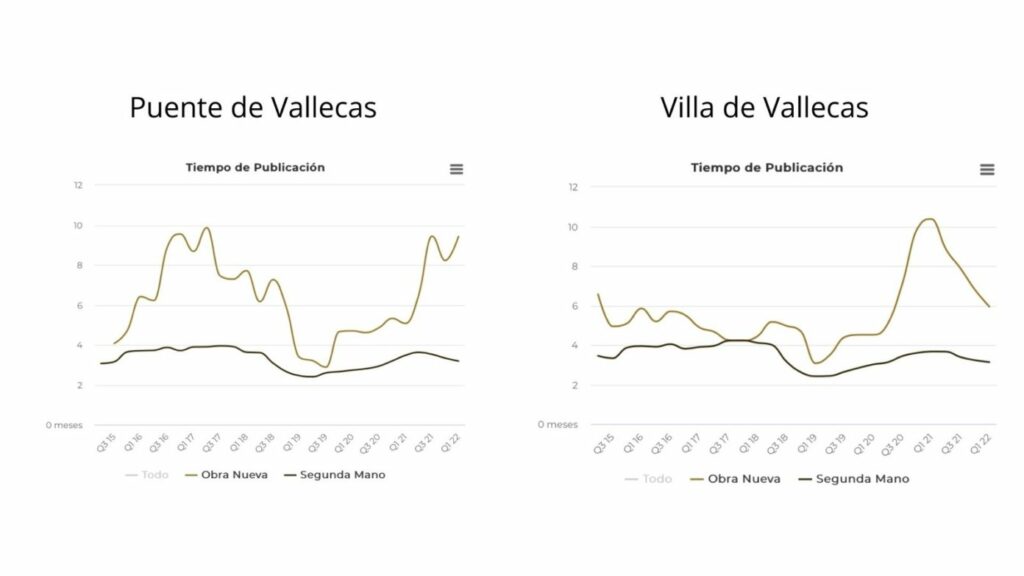 Bien que, dans les deux districts, le délai de publication des logements neufs soit nettement plus long que celui des logements de seconde main, qui reste stable, à Villa de Vallecas, ce délai a fortement diminué au cours de l’année dernière. Cela démontre le boom de l’intérêt pour les nouveaux développements dans la région.