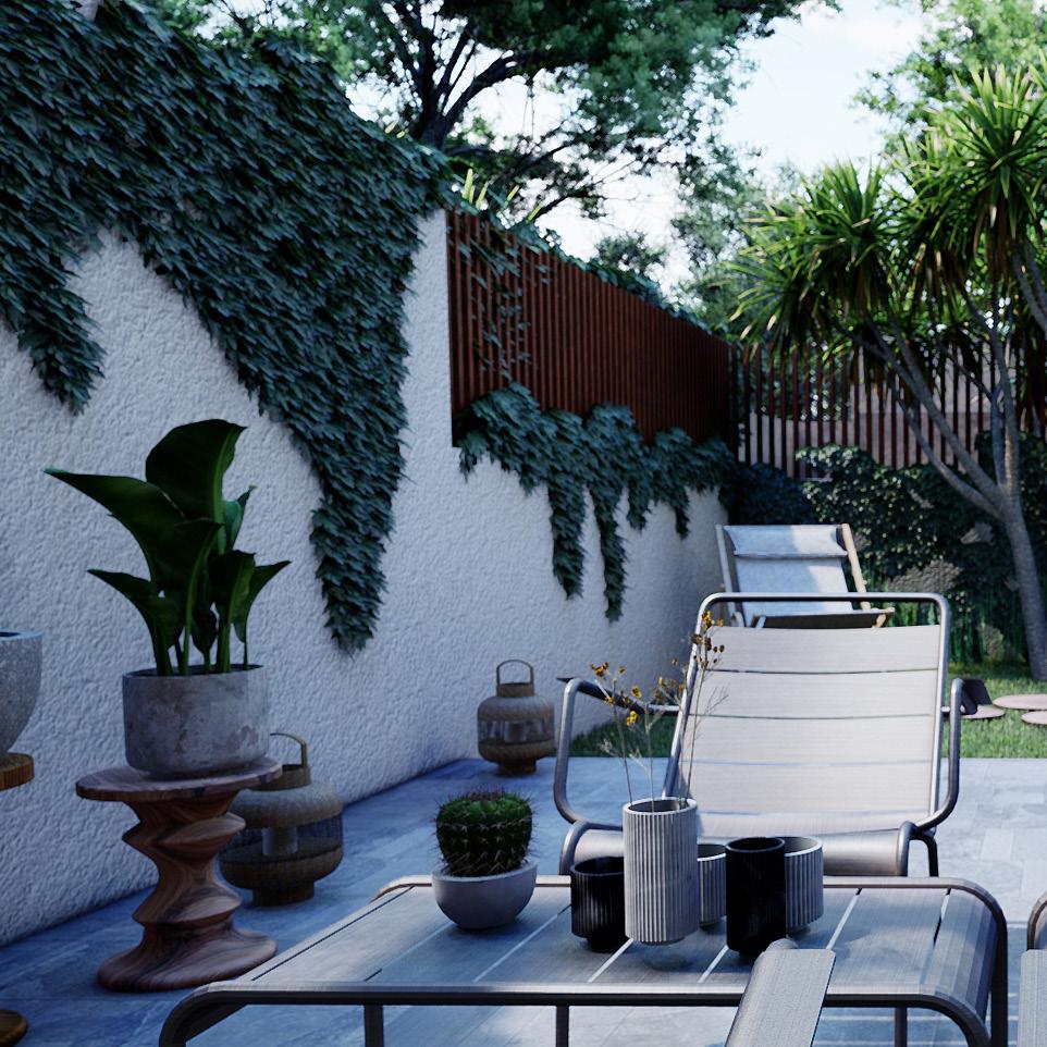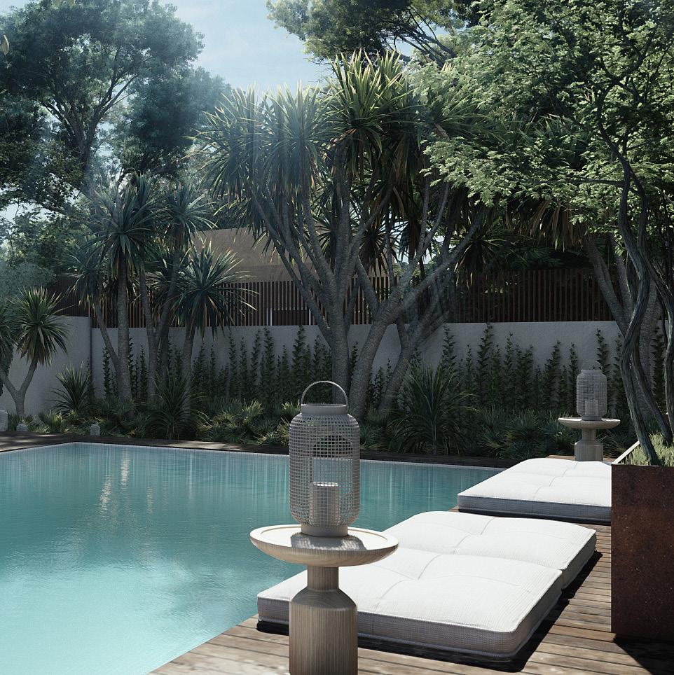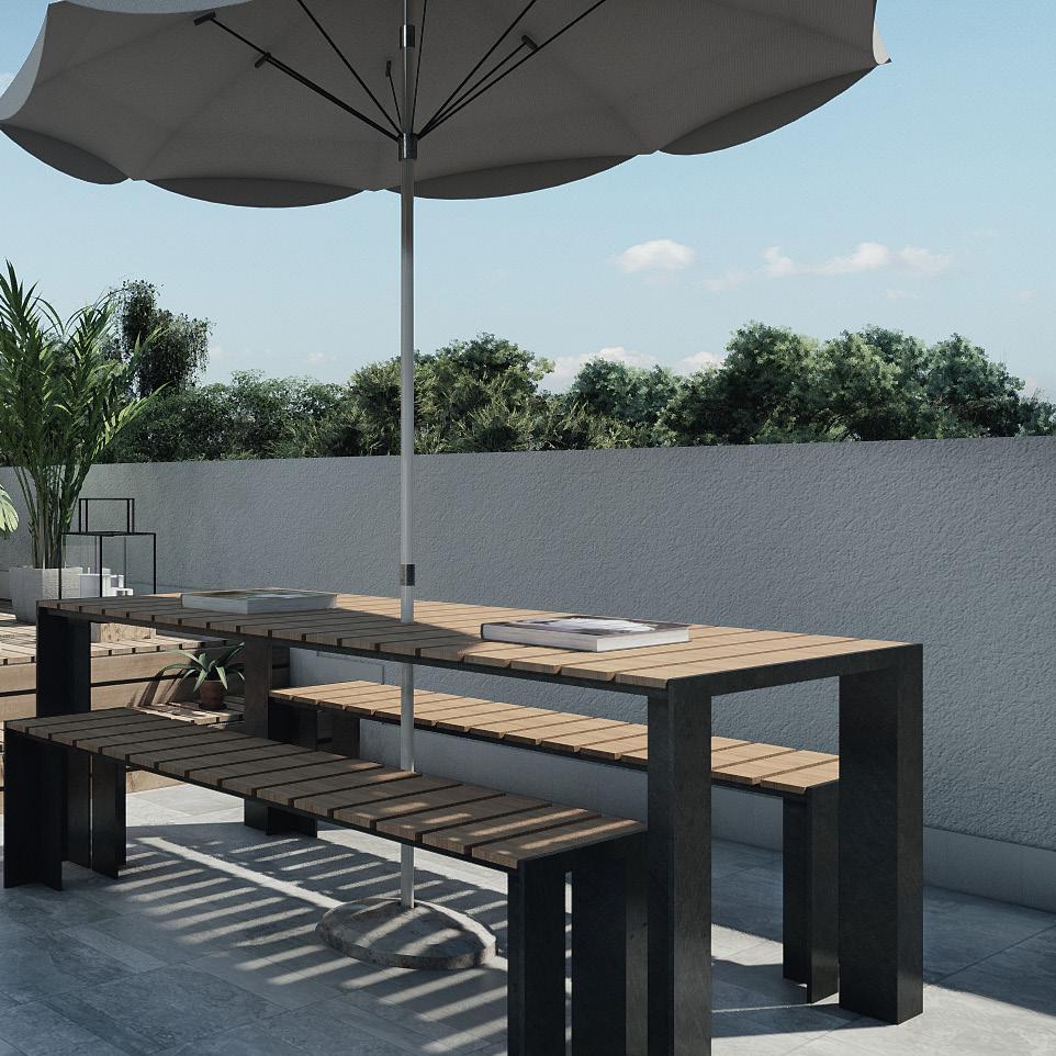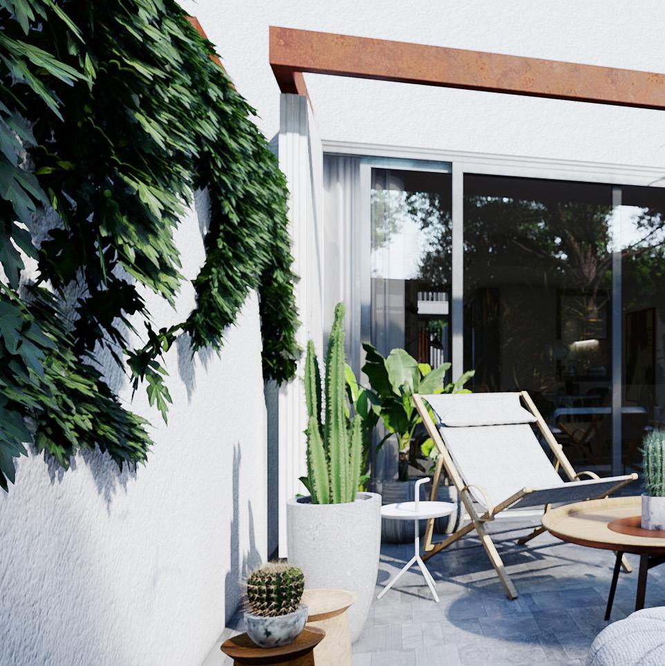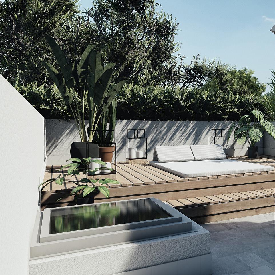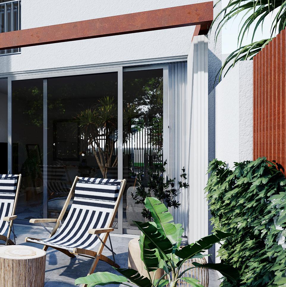 Les finitions de la maison viseront à respecter l’environnement de la maison à tout moment, en utilisant des matériaux naturels dans les trottoirs et les clôtures extérieures et les éléments de protection solaire, en utilisant des murs en pierre, en bois et blancs.