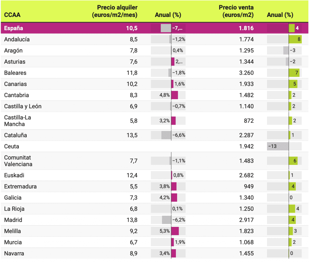 Les prix des logements à vendre par autonomie ont laissé une augmentation majoritaire, avec des augmentations dans 15 régions, en tête l’Andalousie (8%), les îles Baléares (6,6%), la Communauté de Valence (5,5%) et les îles Canaries (5, 3 %). Au-dessous de l’augmentation de 5% se trouvaient l’Estrémadure (4,4%), Madrid (4,3%) et La Rioja (4%), et avec des augmentations plus douces suivies de Castilla-La Mancha (2,1%), Murcie (1,9%), Cantabrie (1,7%). ), Castilla y León (1,3%), Catalogne (1,1%), Pays Basque (0,7%) ou Navarre (0,3%)