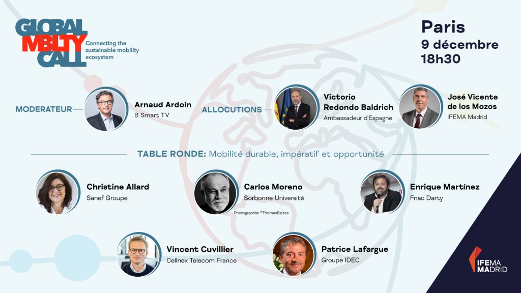 Paris, le 9 décembre 2021 – À la suite de sa présentation internationale à la COP26 de Glasgow, le Global Mobility Call a été présenté en France aujourd’hui auprès de sociétés françaises majeures qui mènent le développement d’une mobilité sûre, inclusive, connectée et durable. La présentation de ce nouveau projet phare de IFEMA MADRID a eu lieu à la résidence de l’ambassadeur d’Espagne à Paris.