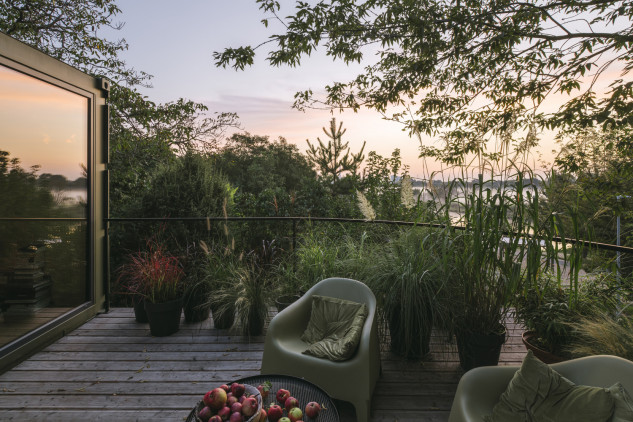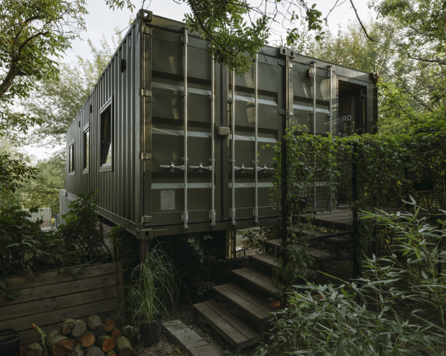 Le résultat est un espace de vie à l’année composé de deux conteneurs de transport adaptés, 12 x 2,5 mètres et 2,9 mètres de haut. La cabane a été partiellement placée sur le toit de conteneurs précédemment debout, qui servent d’espace de stockage pour un jardin. En raison de la pente du terrain et des vues, le solide a été déplacé sur la moitié de sa longueur, créant une grande terrasse d’un côté face à la rivière voisine, et de l’autre côté, il s’est approché de la parcelle, diminuant la hauteur nécessaire pour accéder au intérieur.