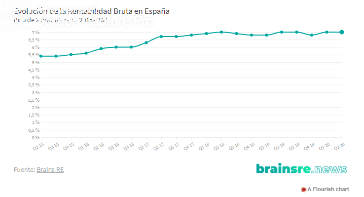 Si nous examinons comment la rentabilité brute a évolué dans notre pays au cours des cinq dernières années, en prenant un appartement de 2 chambres comme un actif typique, nous voyons qu’au deuxième trimestre de 2015, la rentabilité était de 5,4%. , un chiffre qui, selon María Moreno, data scientist chez Brains RE, « augmente progressivement jusqu’au deuxième trimestre 2018, où il culmine à 7% et à partir duquel il reste plus ou moins stable à ce jour ».