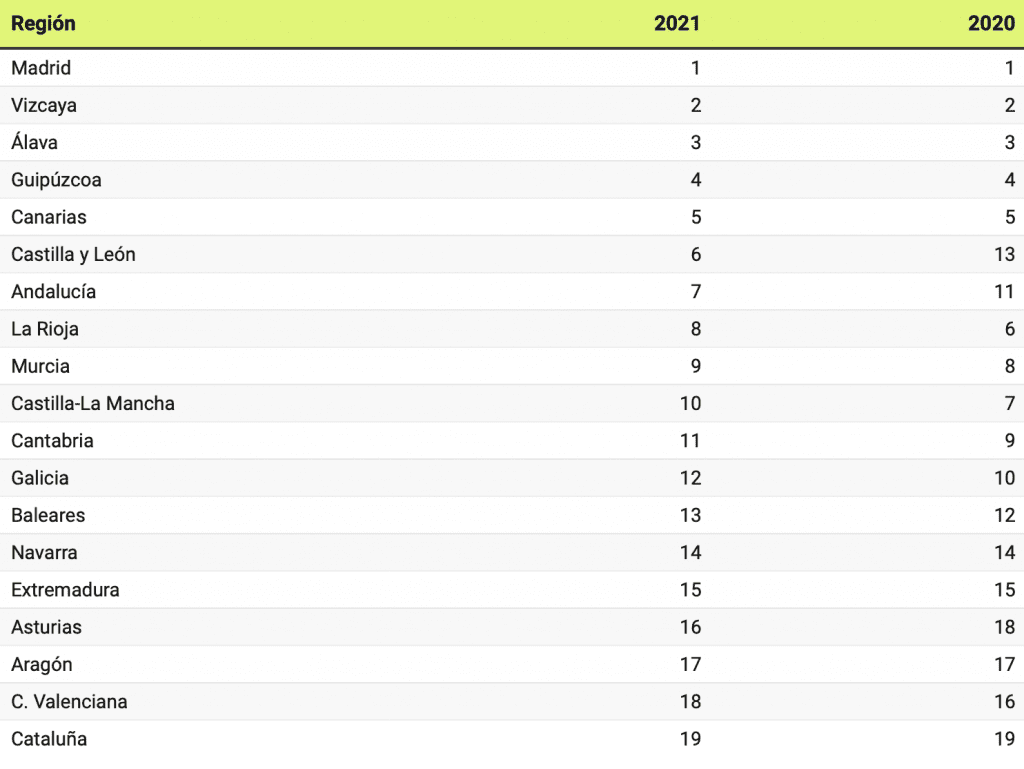 Dans l’édition de cette année, il n’y a aucun changement ni pour la première ni pour la dernière place. Comme en 2020, les régions d’Espagne les plus compétitives en termes fiscaux sont Madrid, les trois provinces basques et les îles Canaries, tandis que l’Aragon, la Communauté valencienne et la Catalogne sont les lanternes rouges du classement. En revanche, il y a eu des modifications dans les positions intermédiaires :