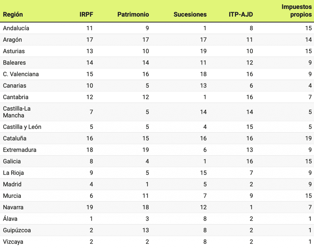 L’étude précise que l’indice de compétitivité fiscale autonome est un indice hiérarchique conçu à partir de cinq composantes : impôt sur le revenu, impôt sur la fortune, impôt sur les successions, taxe sur les transmissions patrimoniales (ITP) et actes juridiques documentés (AJD), et les propres taxes régionales. Et c’est la position générale qu’occupe chaque autonomie dans chaque chiffre fiscal, avec des liens dans certains cas :