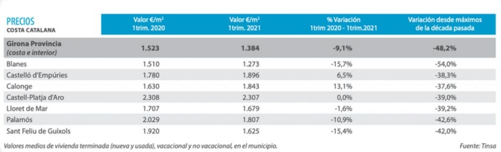 L’effet sur les prix s’est généralisé et accentué aux deuxième et troisième trimestres 2020 avec une reprise sur les premiers mois de 2021. Dans toutes les communes, la demande a plus ou moins augmenté à partir du deuxième semestre 2020, avec des localités en fonctionnement à des vitesses différentes et se traduisant par une tendance à la hausse très modérée des prix. Au cours du deuxième trimestre 2020 des baisses modérées ont été enregistrées à quelques exceptions près, comme dans le noyau urbain de Palafrugell, où la valeur des maisons unifamiliales avec patio ou jardin a légèrement augmenté. Le prix des logements d’occasion enregistre une légère hausse. Les logements locatifs ont fait baisser les prix au cours des 12 derniers mois, d’environ 10 %