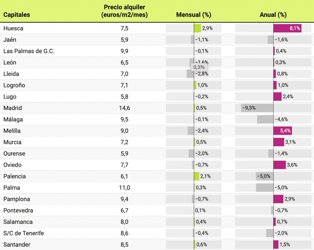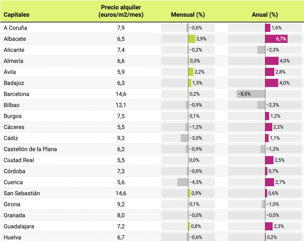 Au cours de la dernière année, 17 capitales ont connu des baisses des prix des logements à louer. Les baisses les plus prononcées sont celles de Madrid, où les loyers ont baissé de 9,3%, et de Barcelone, où ils ont baissé de 8,5%. Au cours du dernier mois, en revanche, le prix a augmenté de 0,5% à Madrid et de 0,2% à Barcelone.